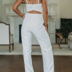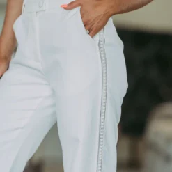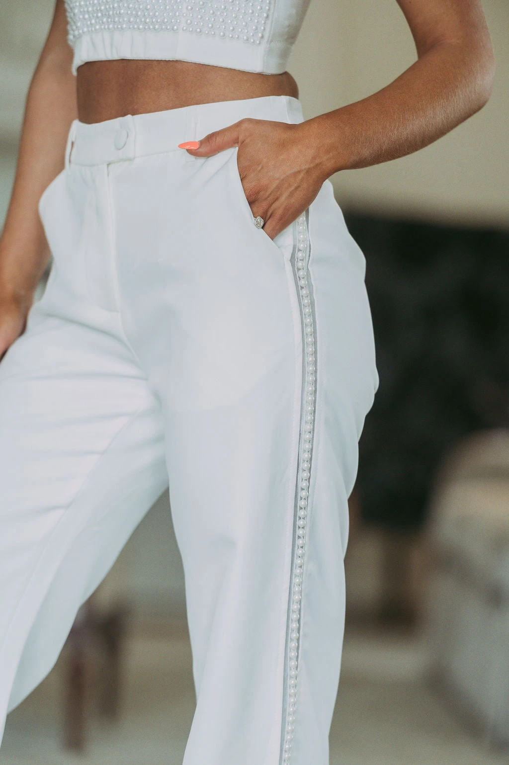 Make a statement with these white dress pants featuring a high waistline and pearl detailing down the sides. Made with a classic style, the pants also include convenient pockets, perfect for carrying all the necessities. Create an unforgettable look for any occasion!