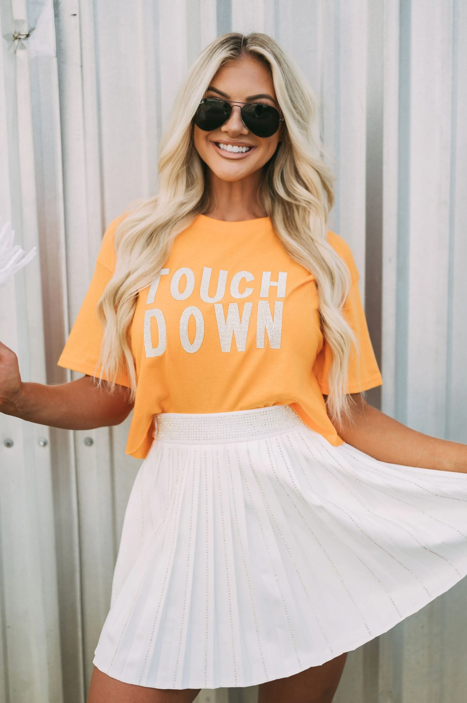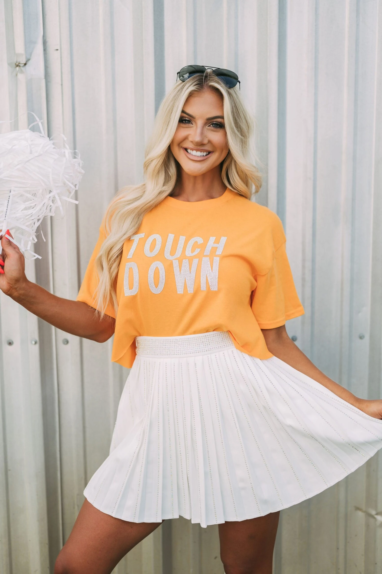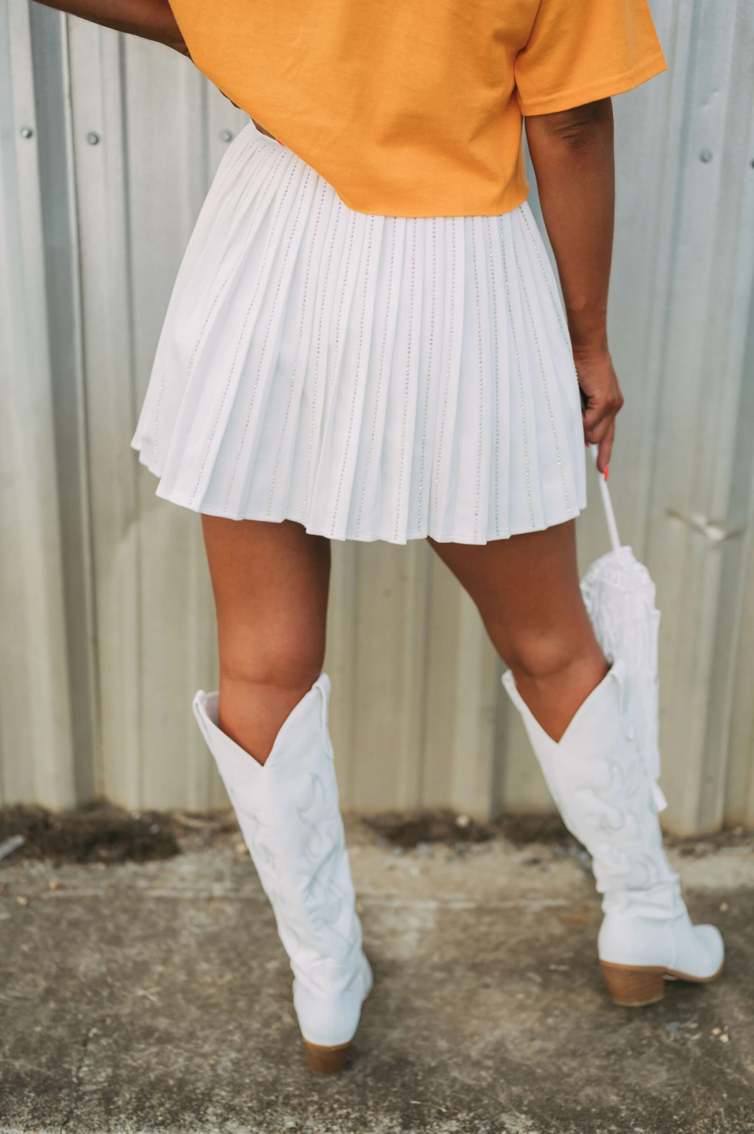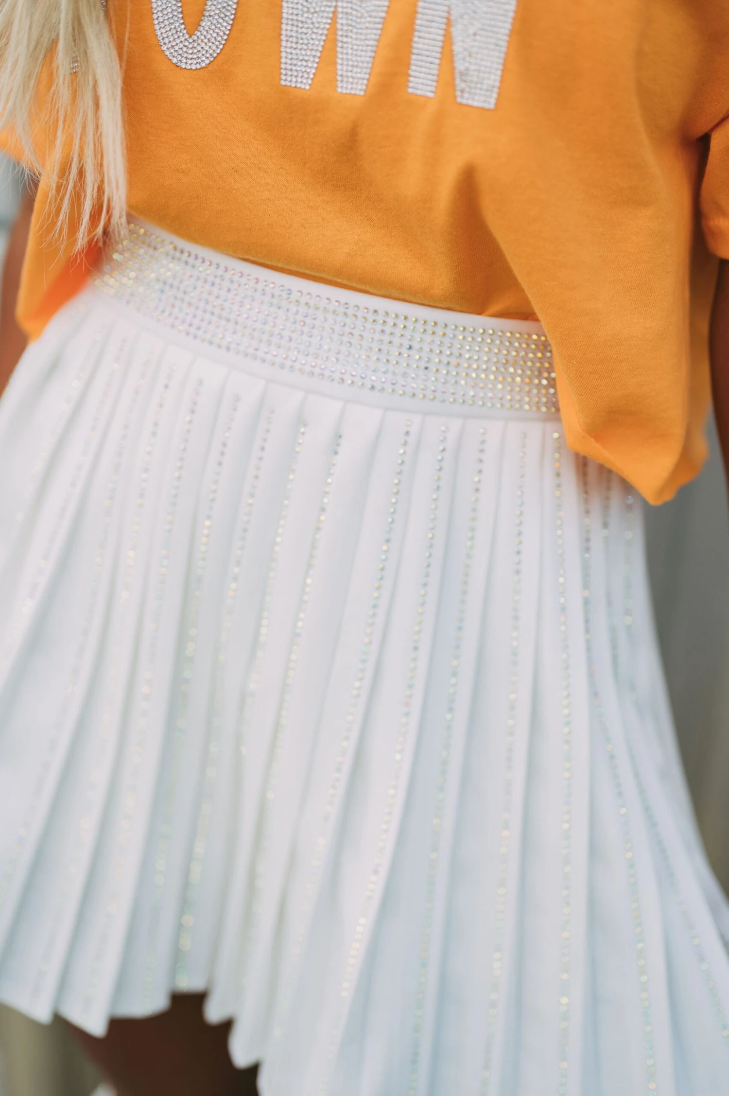 This high-waisted Pleated Embellished Skirt is crafted with a white pleated texture, with intricately designed iridescent rhinestone embellishments for an extra special touch. The zipper closure makes the skirt comfortable and secure to wear. Perfect for formal or casual wear!
