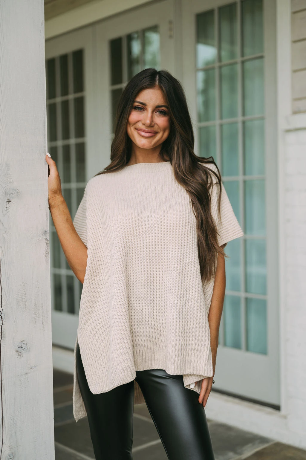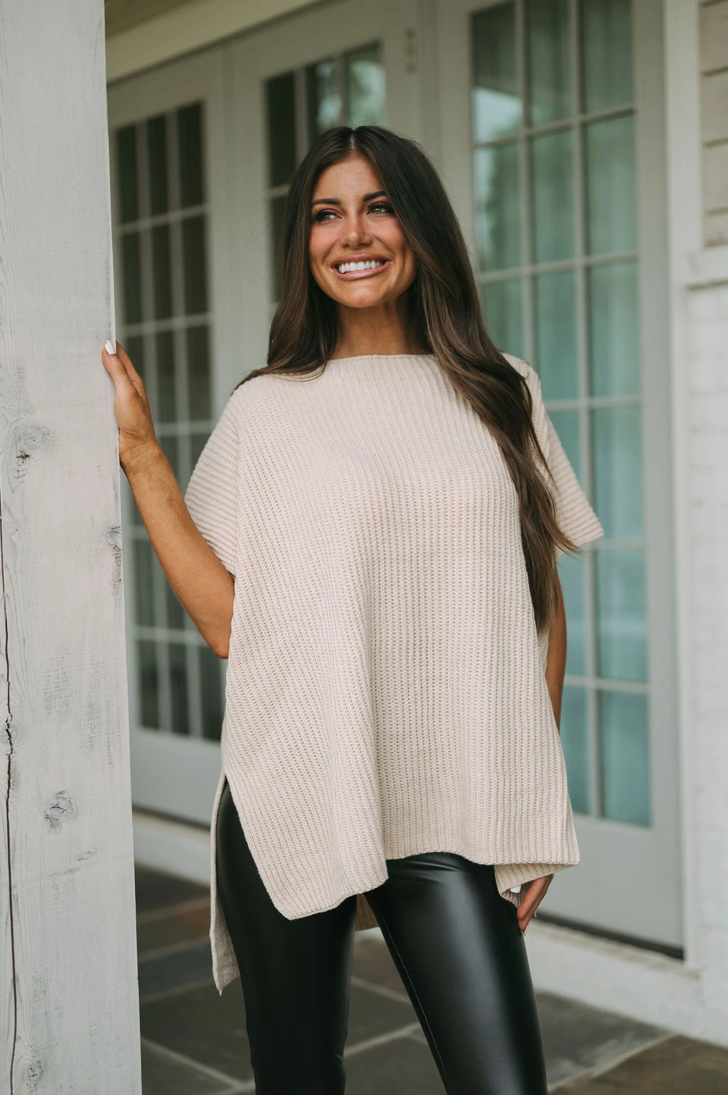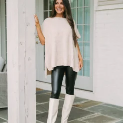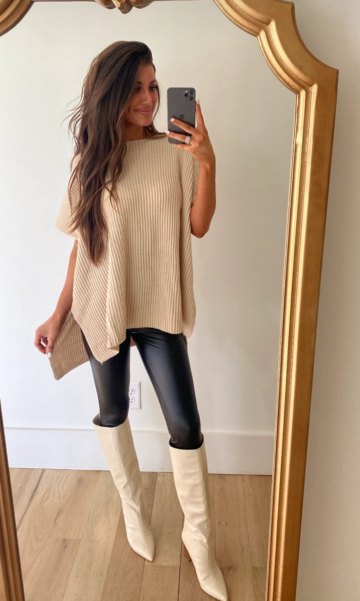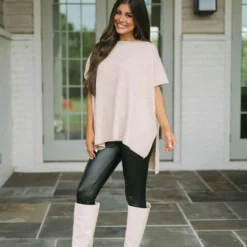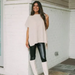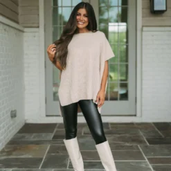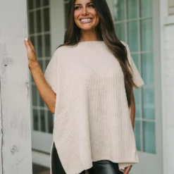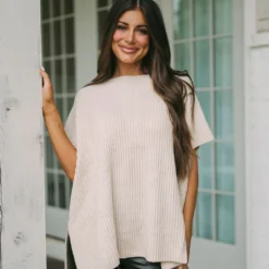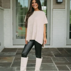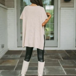 This oversized beige sweater is the perfect addition to any wardrobe. It has long sides with slits and is longer in the back. Wear it casually or dress it up, you’ll be sure to stay warm and cozy in style.