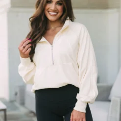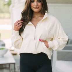 Be ready to tackle any outdoor adventure in this quarter zip pullover. Made with a comfortable, cream-colored fabric, this wardrobe staple keeps you cozy and allows plenty of mobility. The collared neckline and quarter zip provide styling options, while the two handy side pockets keep essentials close. Enjoy everyday comfort and convenience!