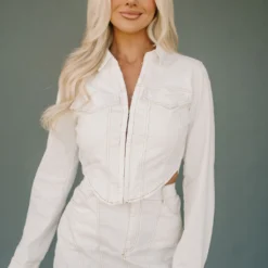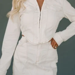 - Bring your wardrobe to life with the Remi Denim Set! This white denim set features front clasp closures, a high waisted skirt, and an asymmetrical bottom hem to make any look stand out. Don’t wait – give your wardrobe the update it deserves!
