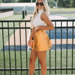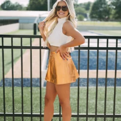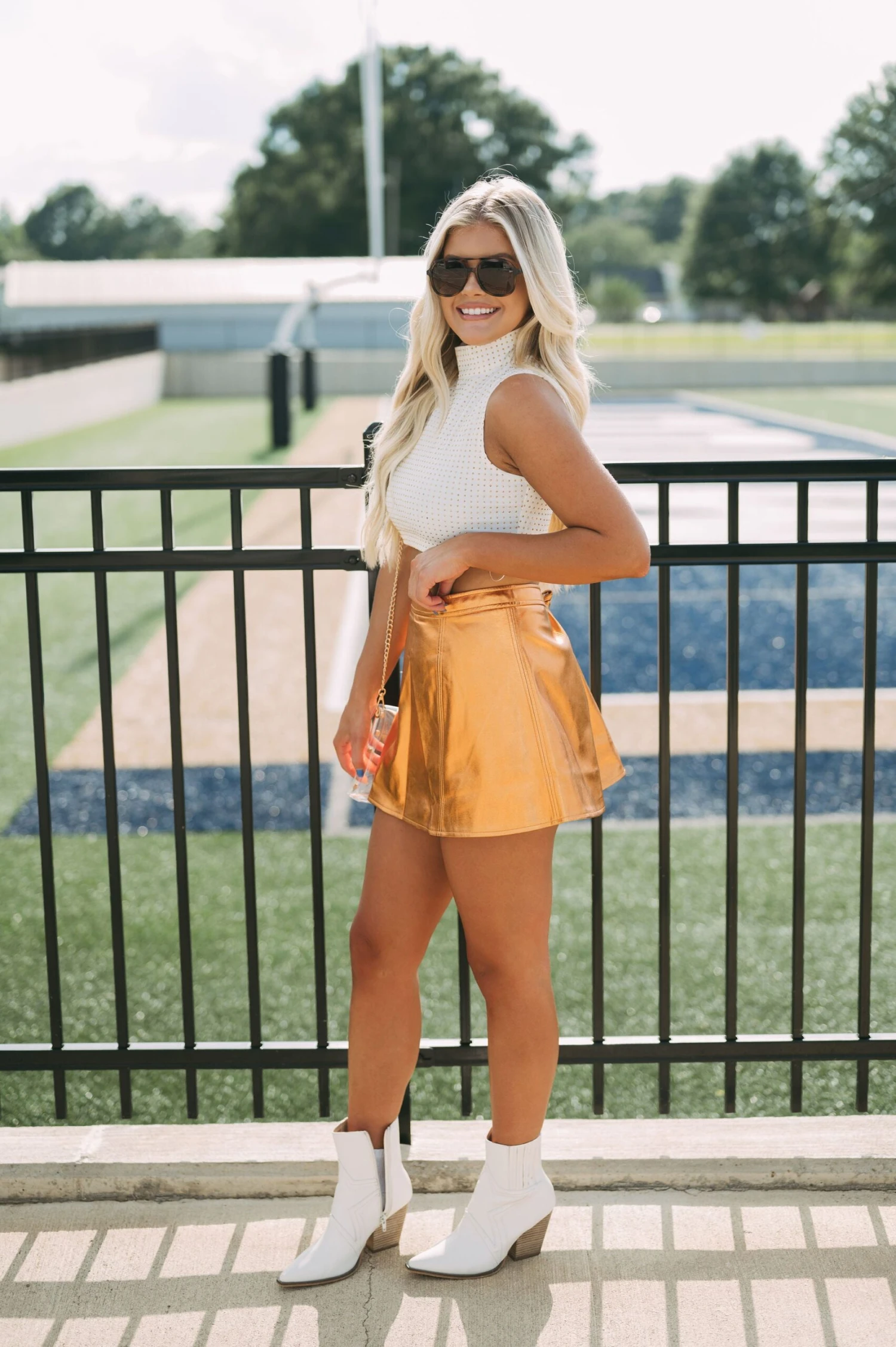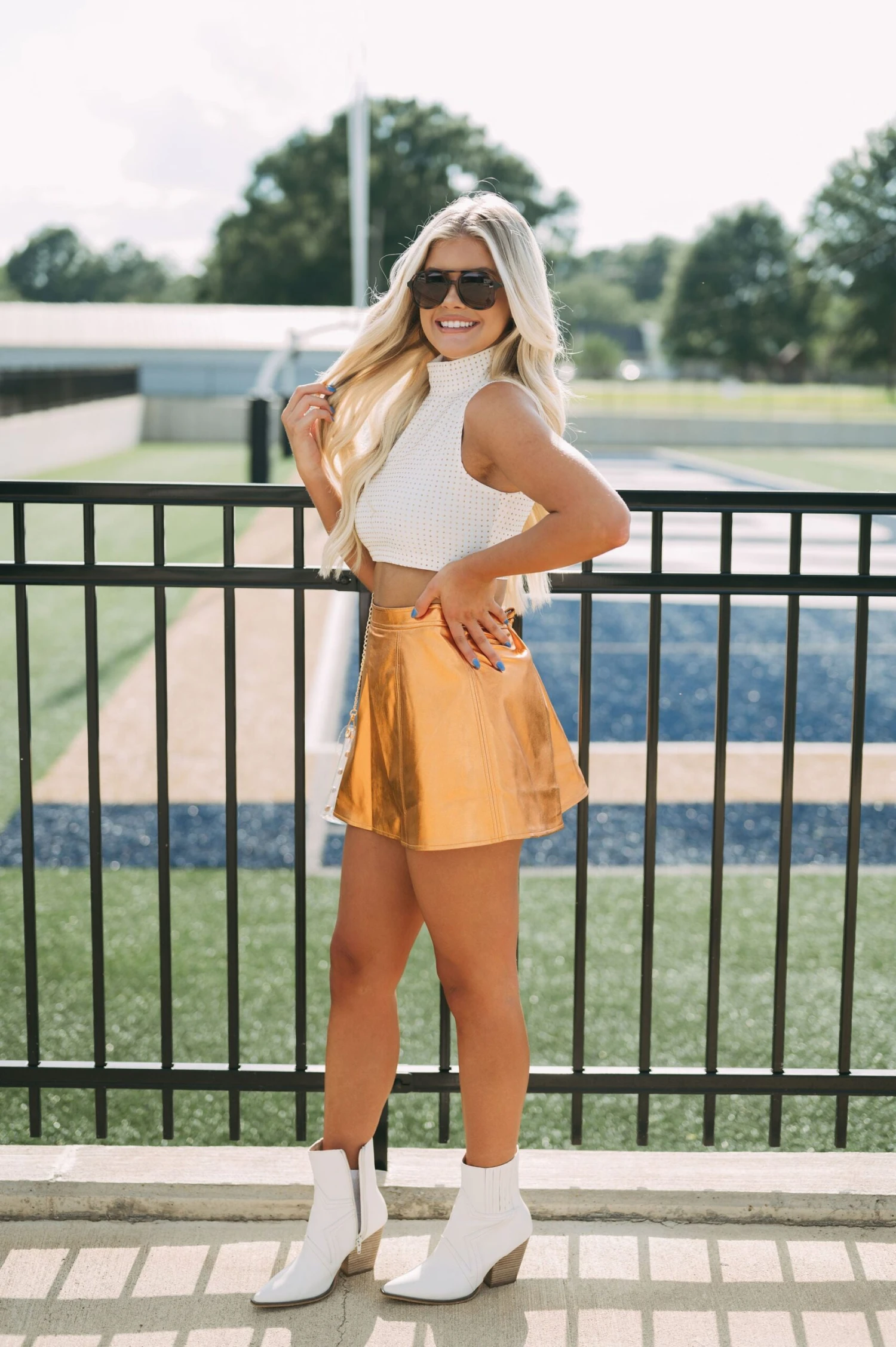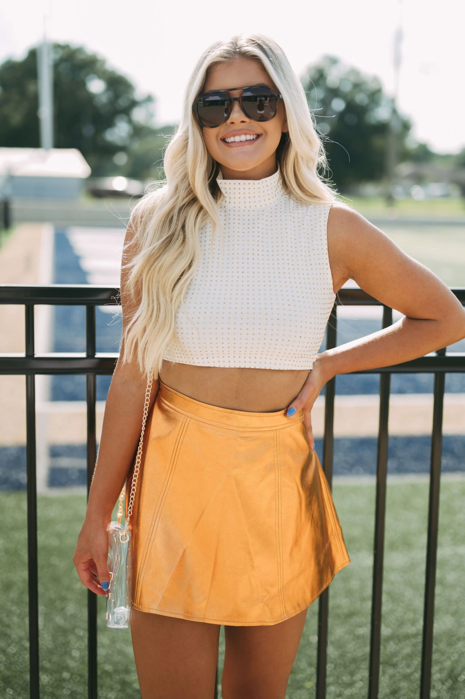 Be inspired by style and elegance with this Rhinestone Mock Neck Top- white. Designed with a mock neckline and a cropped waist, this top will give you an elegant silhouette. The zipper closure back and gold rhinestone allover detailing adds an extravagance to this stylish top.