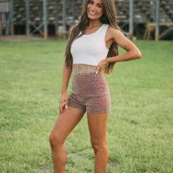 Shine and sparkle all night with our Rhinestone Tassel Top! Crafted with a stretchy and breathable fabric, this cropped white tank top features rhinestone tassels on the bottom to create a dazzling look no one will forget! Show off your style and light up the night!