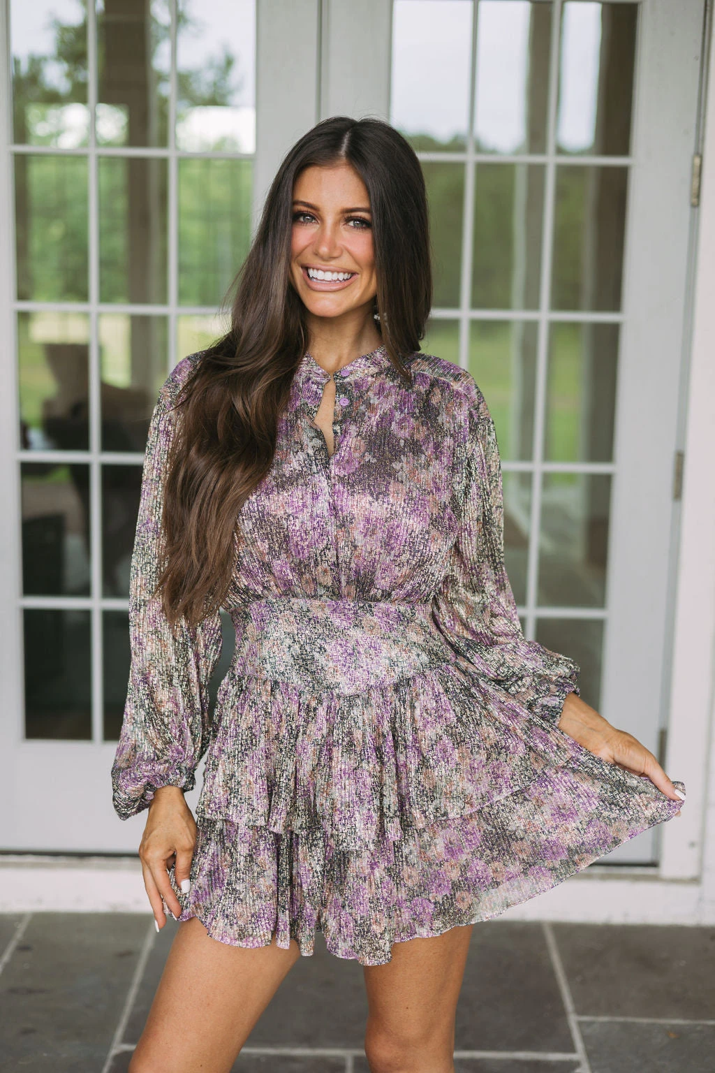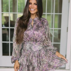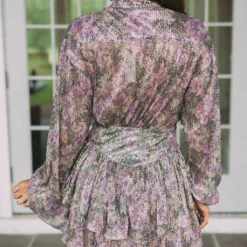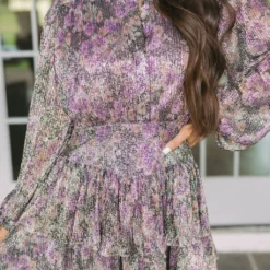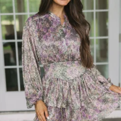 This Ruffled Floral Dress makes a radiant statement! Its purple and black subtle floral print is perfectly enhanced by a gold shimmer finish. It features long sleeves, a button closure front, a ruffled skirt, and a side zipper closure. Feel beautiful and confident in this unforgettable dress!