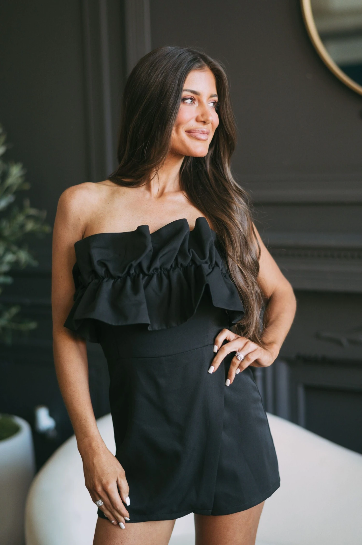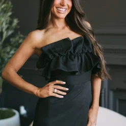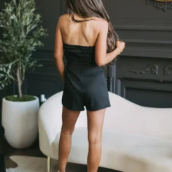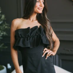 - Feel effortlessly chic in this stunning ruffled overlay romper. Made with a black strapless design and ruffled detailing, this gorgeous romper comes with a front overlay and a back zipper closure to keep you comfortable and stylish all day long.Â