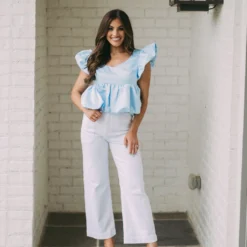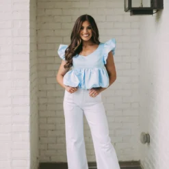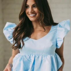 This stunning light blue satin top features ruffled sleeves, a v-neckline, and a cropped bubble style bottom hem. It fastens securely at the back with a zipper closure, ensuring a flattering and comfortable fit for any occasion!