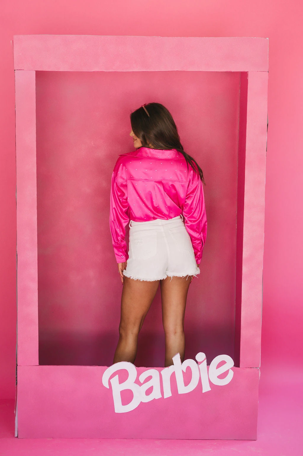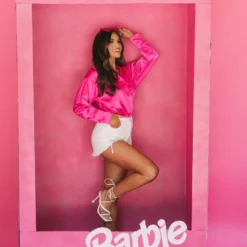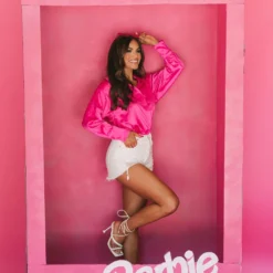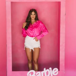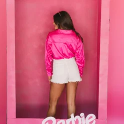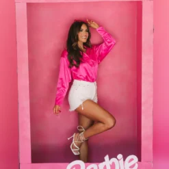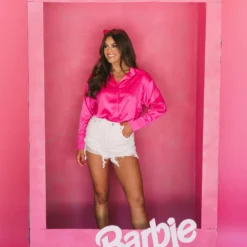 Step up your wardrobe with this satin rhinestone-accented button down top. Crafted from rich hot pink satin, this top features sparkling rhinestone accents for a hint of sparkle, and a slightly oversized fit for all-day comfort. Add some dazzle to your wardrobe today!