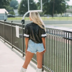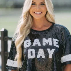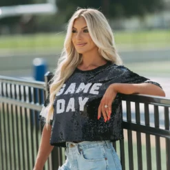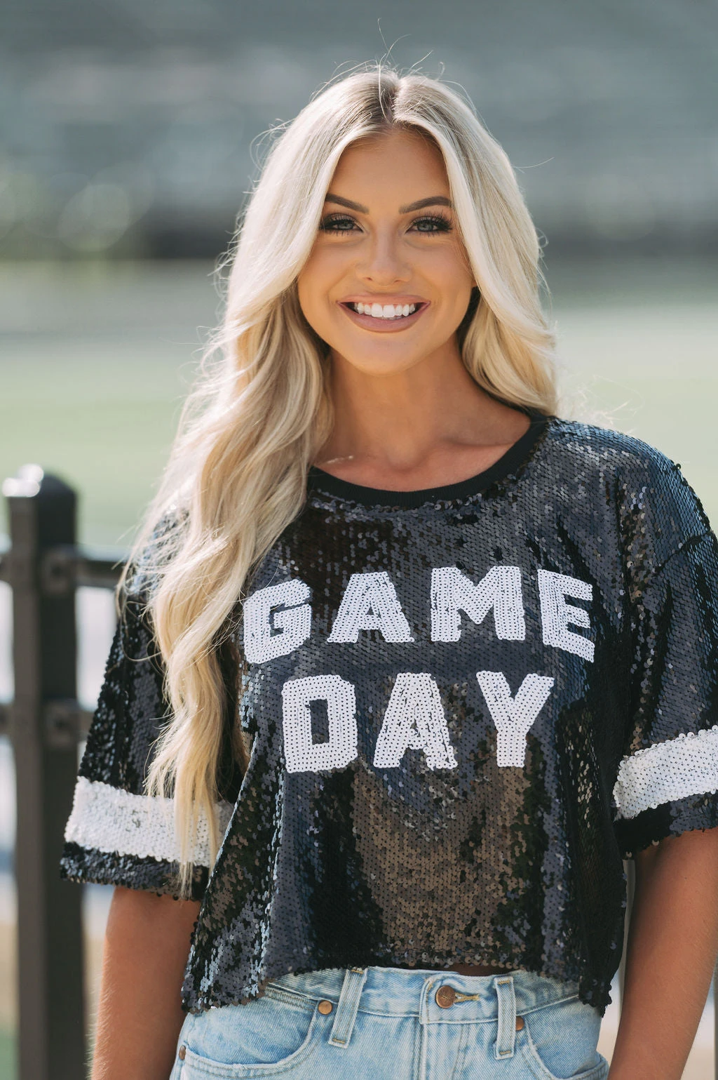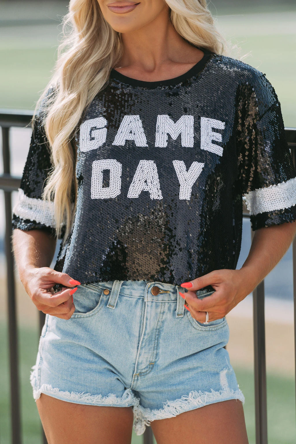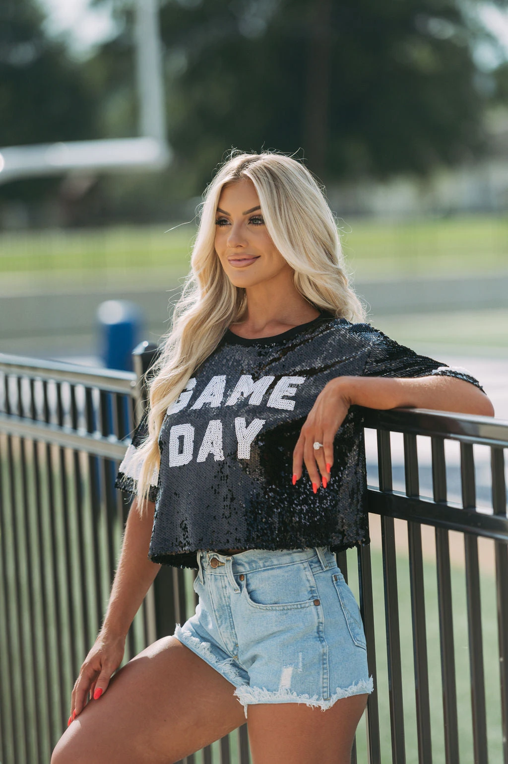 Be ready for game day with this stunning black and white sequin top! The cropped bottom hem is stylish, and the phrase “Game Day” on the front adds a fun touch. Get ready to cheer and sparkle in this look!