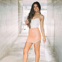 - This bold Sequin Rhinestone Skirt is crafted from a shimmering orange material, featuring a high waisted silhouette and adorned with delicate rhinestone fringe detailing. A back zipper closure ensures an easy and comfortable fit. Complete your wardrobe with this statement piece.