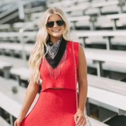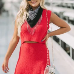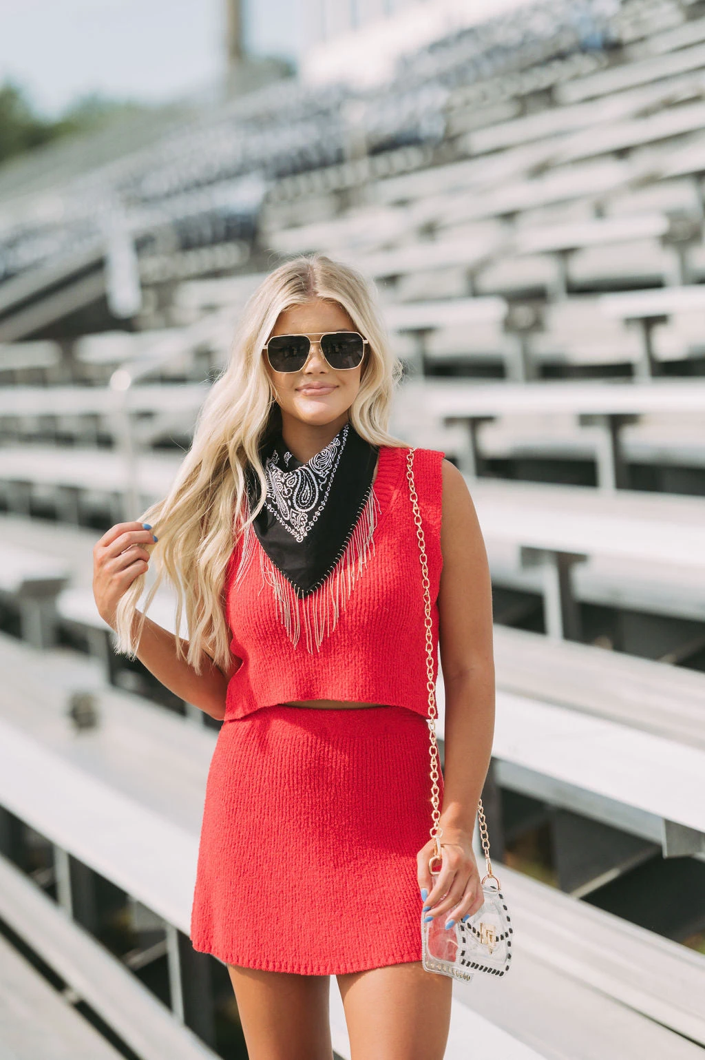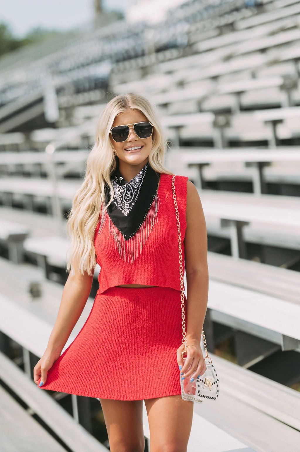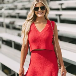 - Red two piece set featuring a sweater knit material, a crop top with a V neckline, and a high waisted skirt!