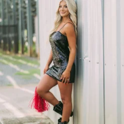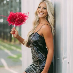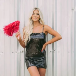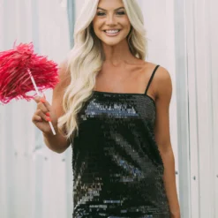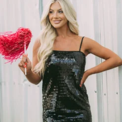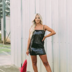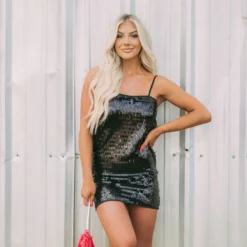 Be party-ready with this sparkling black sequin mini dress. With adjustable spaghetti straps, side zipper closure, and an impressive sheen, you’ll look and feel glamorous all night long. Get ready to shine!