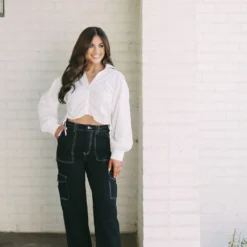 Look cool and stylish in these Stitched Cargo Pants-Black. The high-waisted design and white stitched seams give these pants a unique edge, making them perfect for any casual outing. Step out in style with these must-have cargo pants!