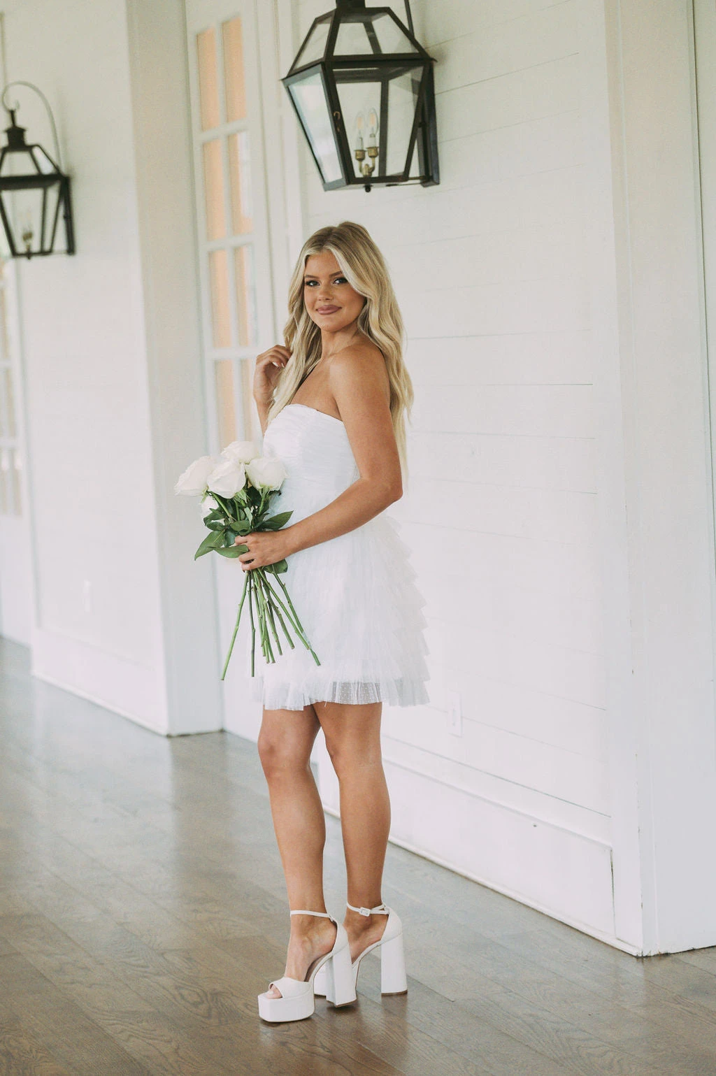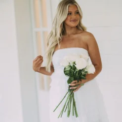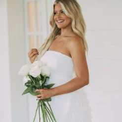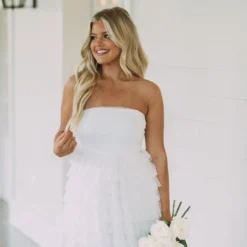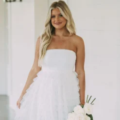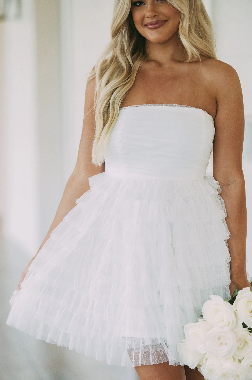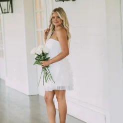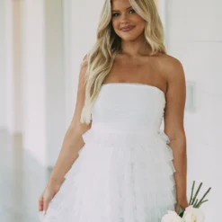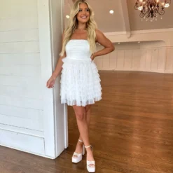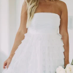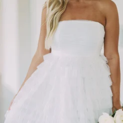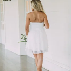 This Strapless Dotted Mesh Dress creates an airy and flirty look for any special occasion. Its white strapless design and dotted mesh fabric make it a timeless piece, while the tiered skirt adds a luxurious edge. Show off your style in this elegant dress!