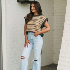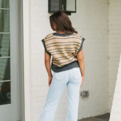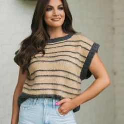 Look fashionable all-season in our Striped Sleeveless Sweater! With its slightly cropped boxy fit, this unique design showcases a classic grey and camel striped style that will never go out of fashion!