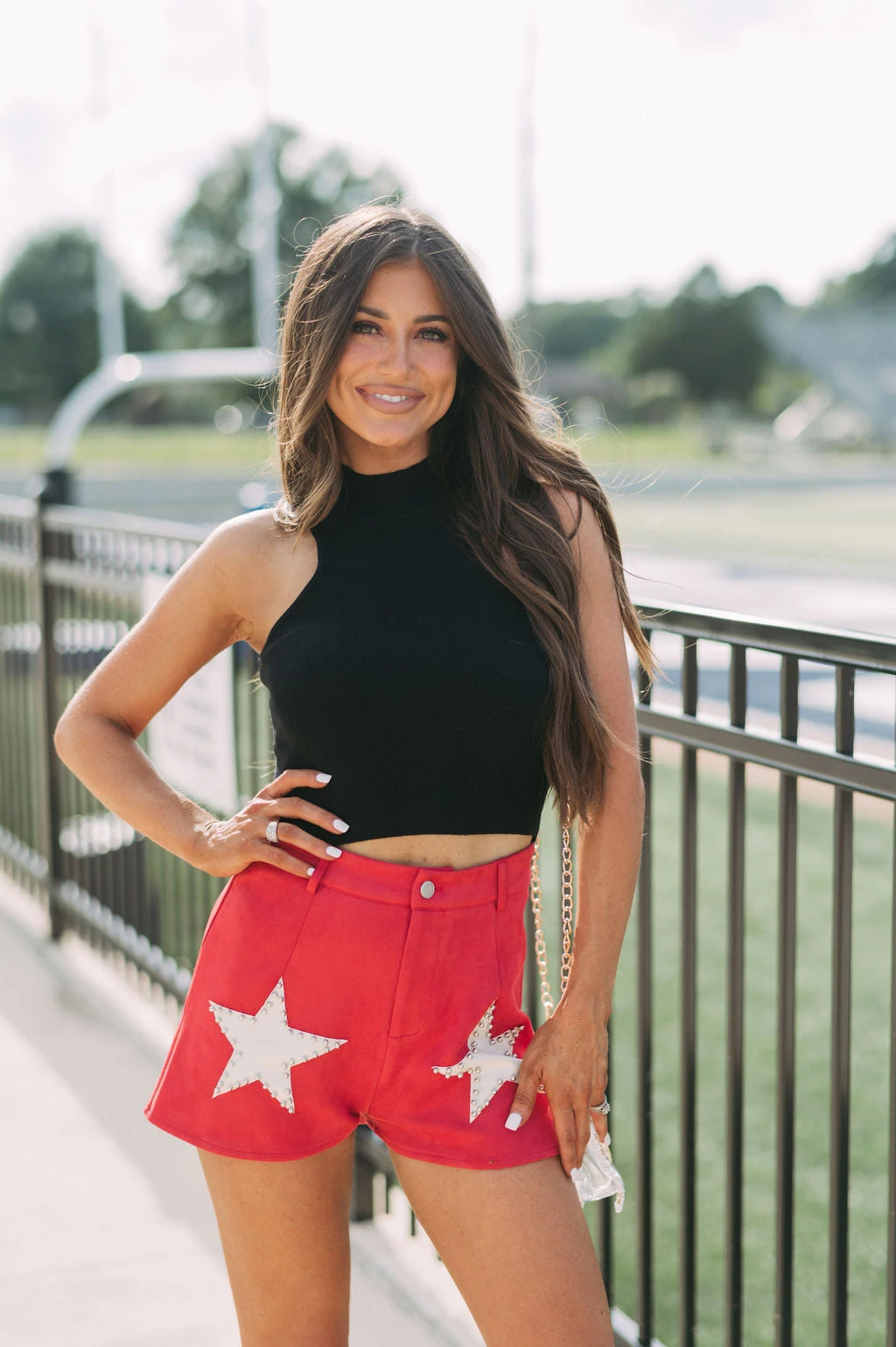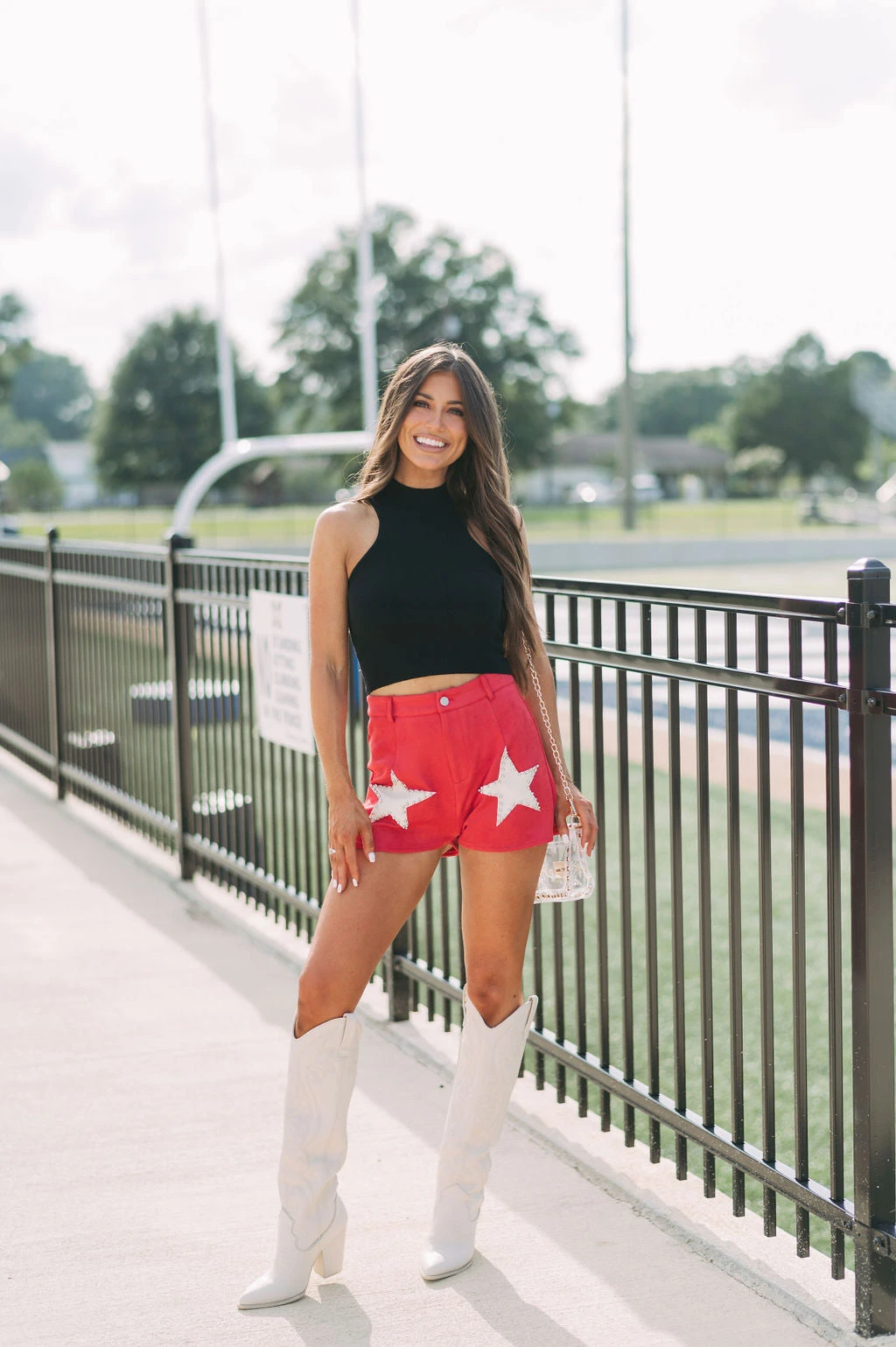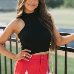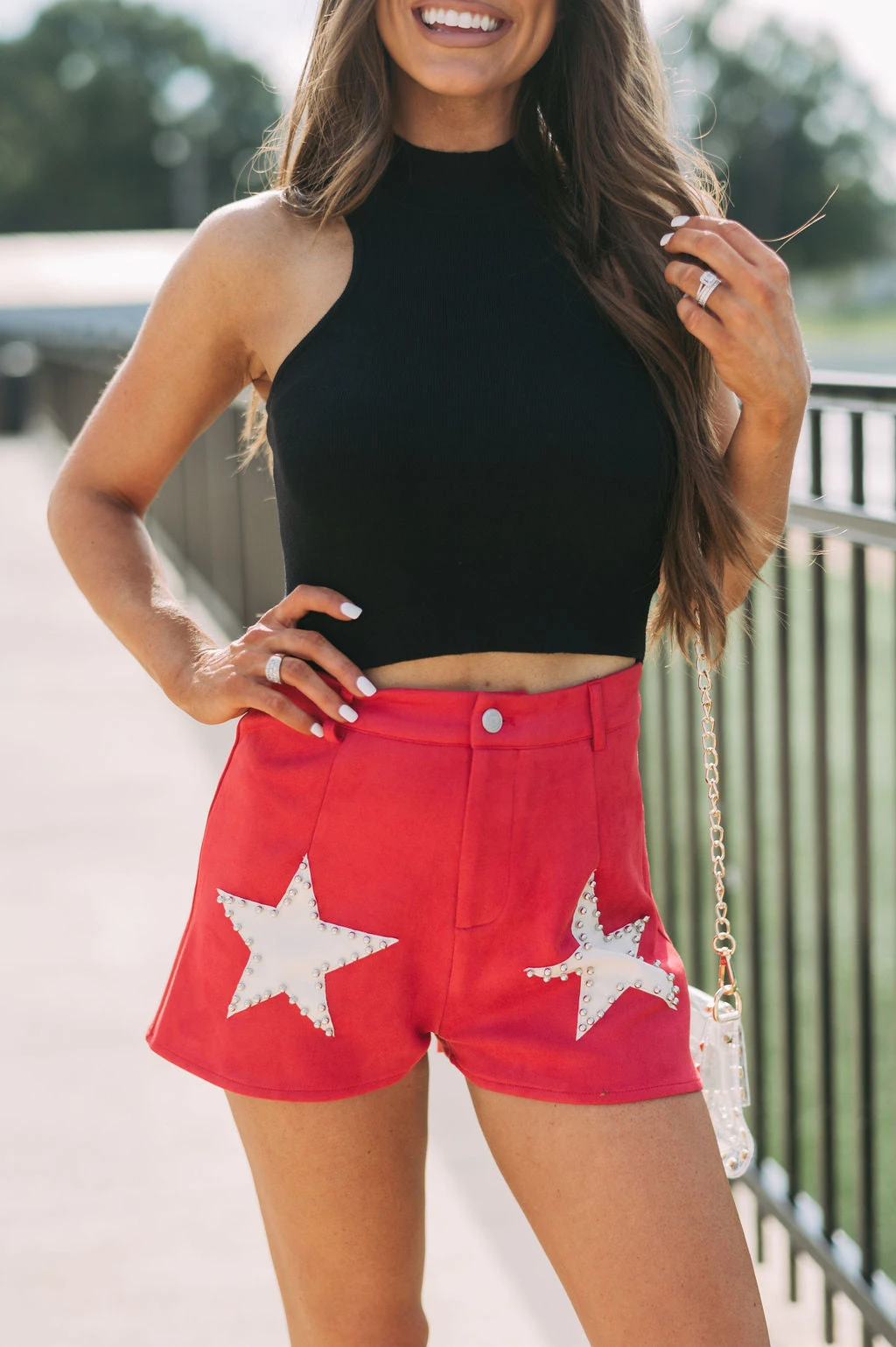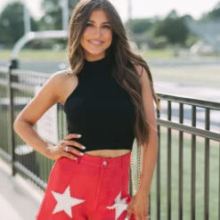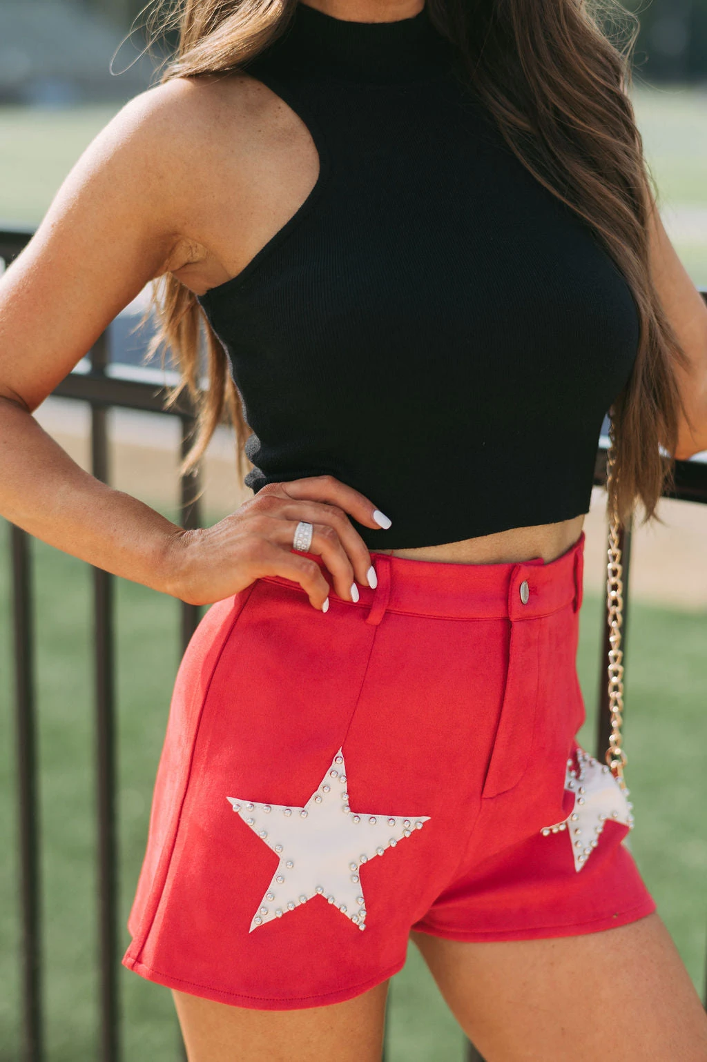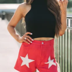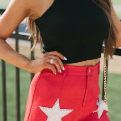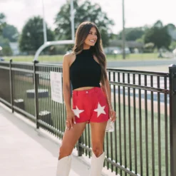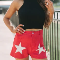 - Make a bold statement in these sleek, red and cream star accented shorts. Crafted with premium suede fabric with a high-waisted fit and button fly closure, these shorts are sure to make an impression. Why not make a star of your wardrobe?