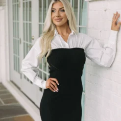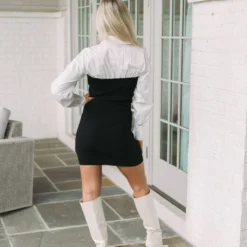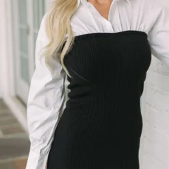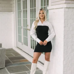 - A lightweight yet cozy outfit perfect for a day out, this Sweater Knit Collared Dress is a stylish and comfortable choice. Featuring a chic off white and black combination, the sweater knit dress features a fitted fit with a collared neckline and button detailing along with cuffed wrists.