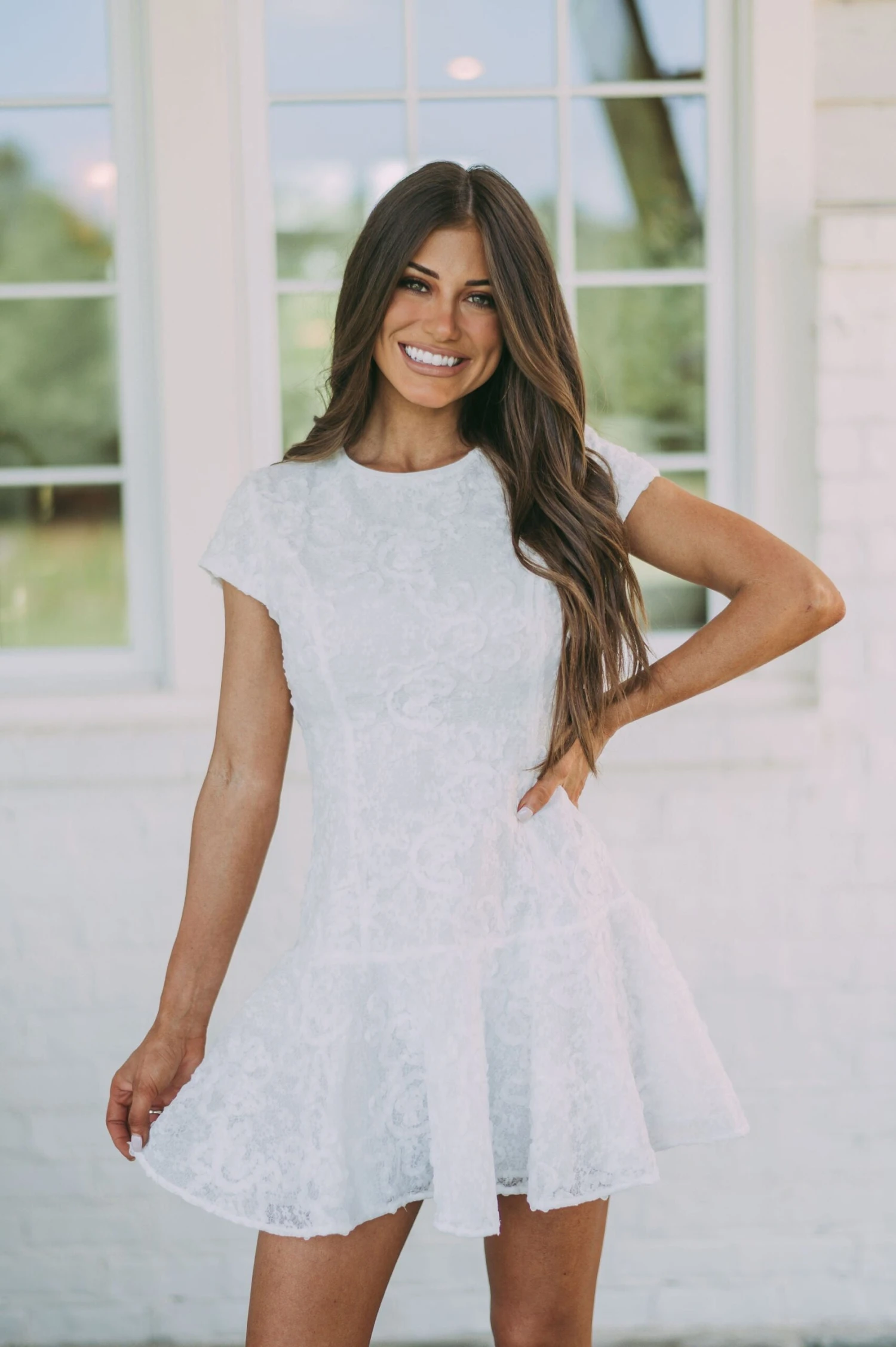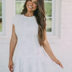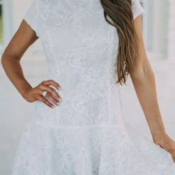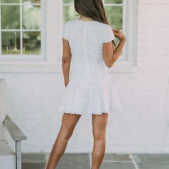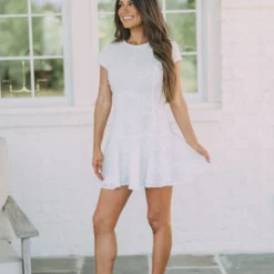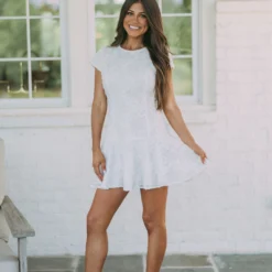 – The Sydney Ruffle Dress is a stunning white lace dress featuring a fitted silhouette with ruffled accents. This sophisticated piece is sure to be a showstopper, with a fit that will flatter and a fabric that will keep you comfortable all night.