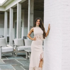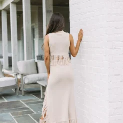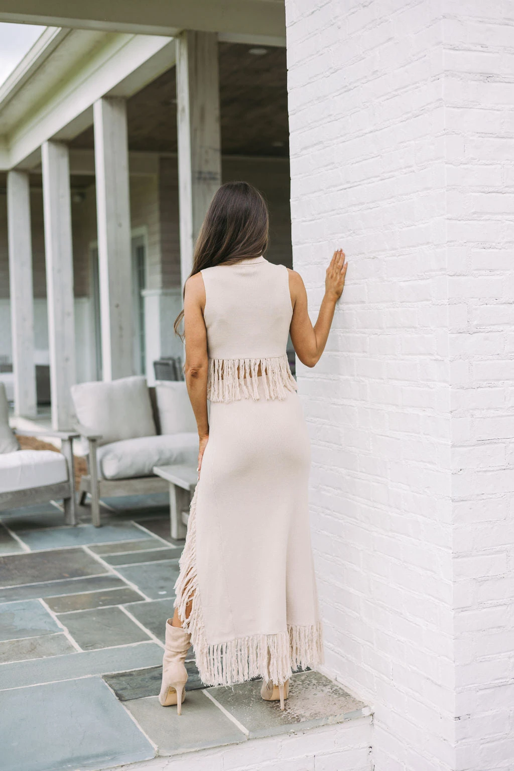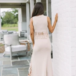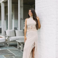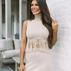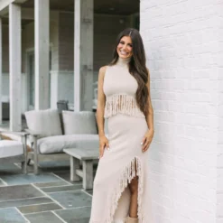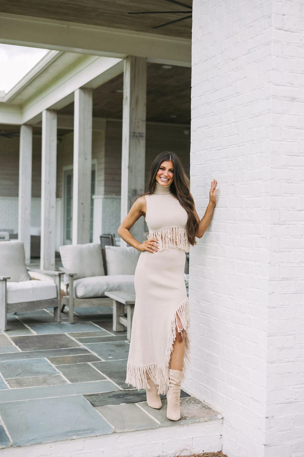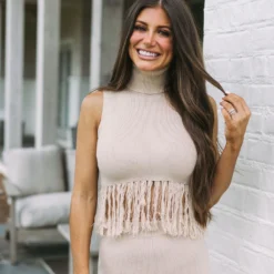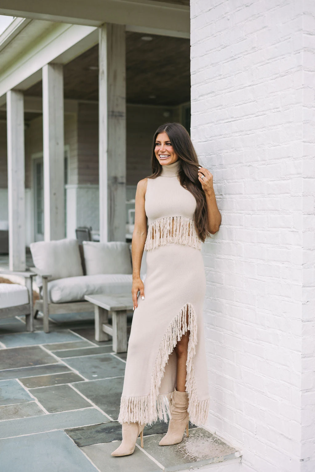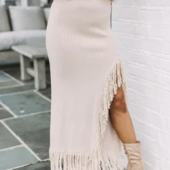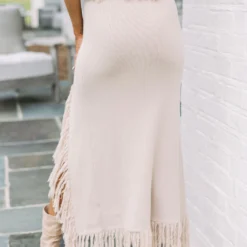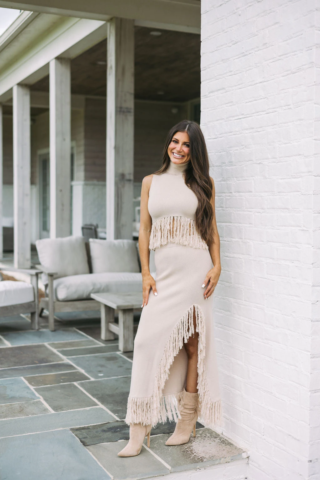 Look stylish and feel confident with this beige Tassel Sweater Skirt Set. The cropped turtleneck features chic fringe trim for a fashionable edge, while the high-waisted skirt with side slit adds a unique touch. Embrace your fashionable side—order now!