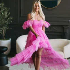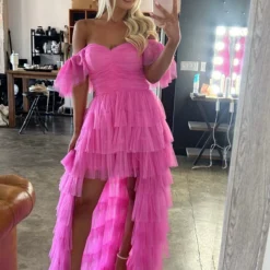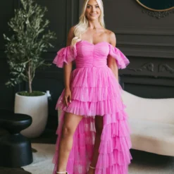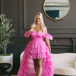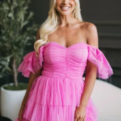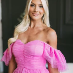 Elevate your look with the Taylor Mesh Dress-Pink; a pink mesh mini dress with off the shoulder sleeves, tiered and ruched detailing, a maxi style train and side zipper closure for easy wearability. Make a powerful fashion statement and look your best with this eye-catching dress!