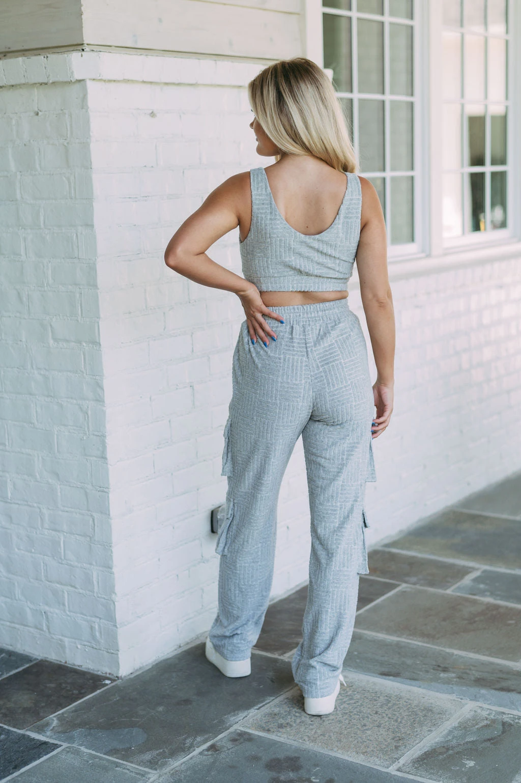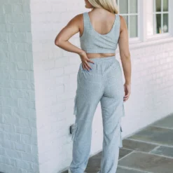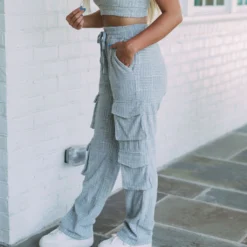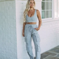 Enjoy a cozy, comfortable fit with these high-waisted cargo pants featuring textured French Terry fabric. Crafted in a subtle shade of heather grey, these pants are perfect for all of your relaxing activities!