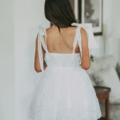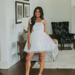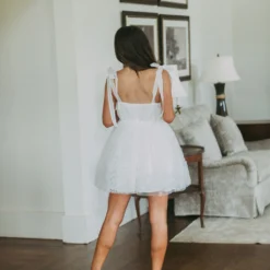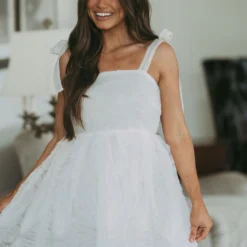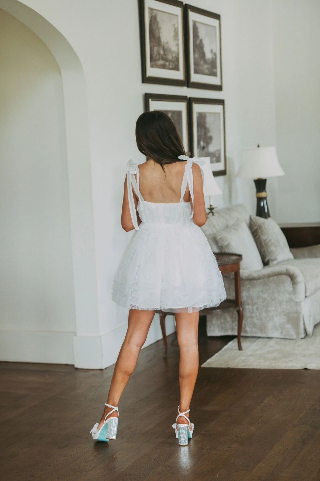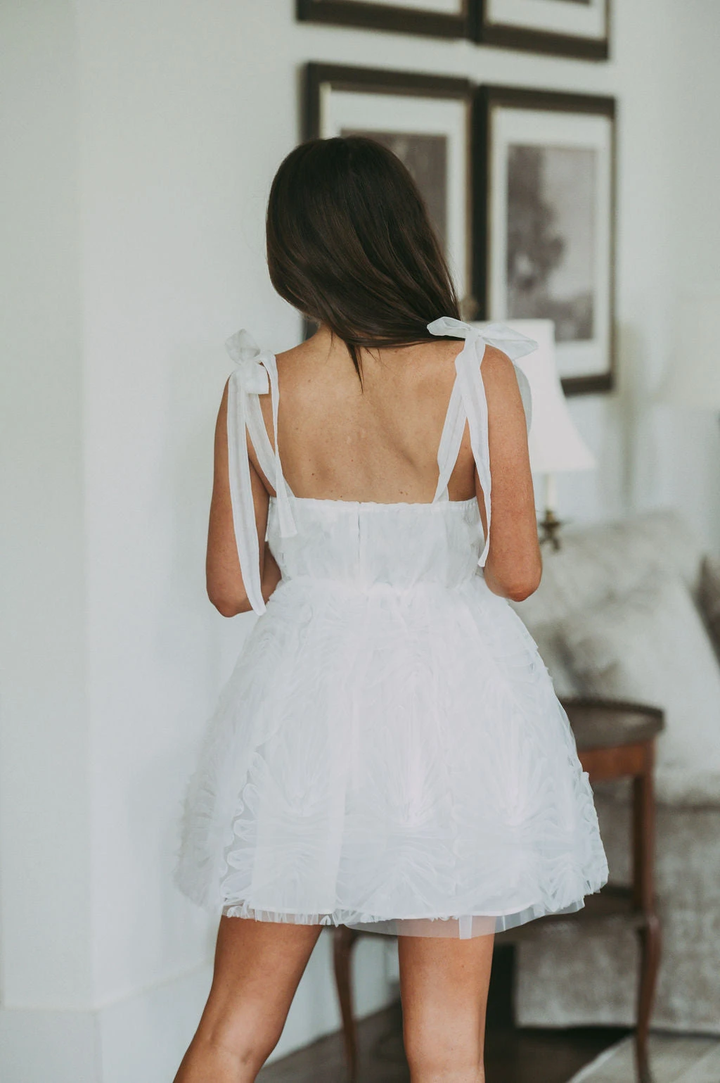 This white textured organza dress is the perfect staple item for any wardrobe. With shoulder tie straps and a flowy skirt, it offers the perfect combination of comfort and style!