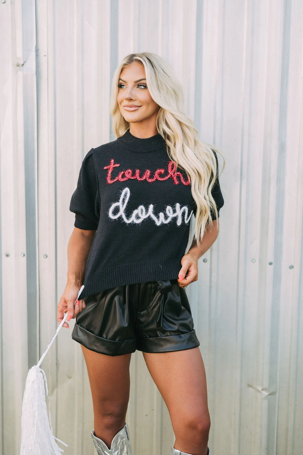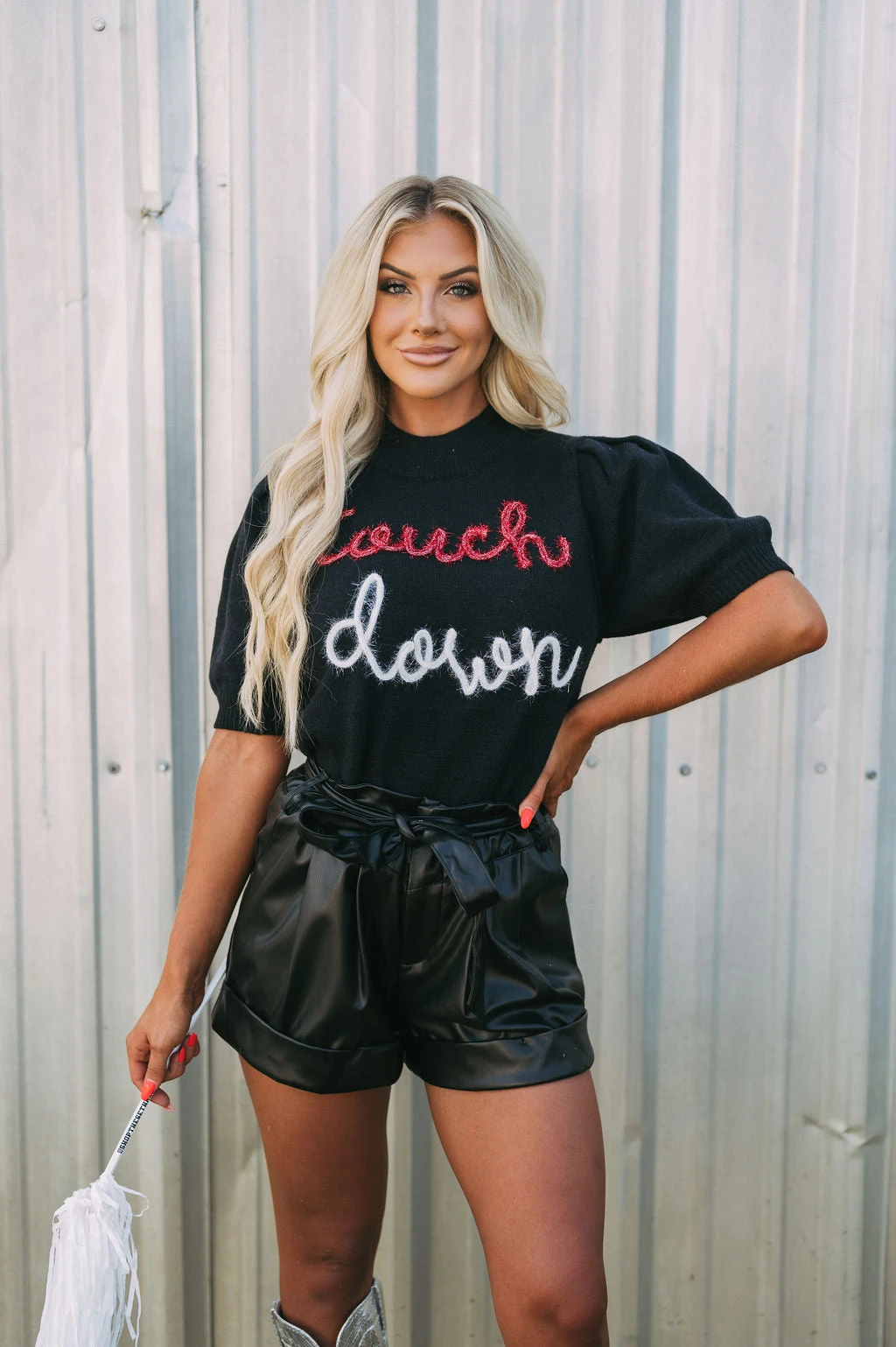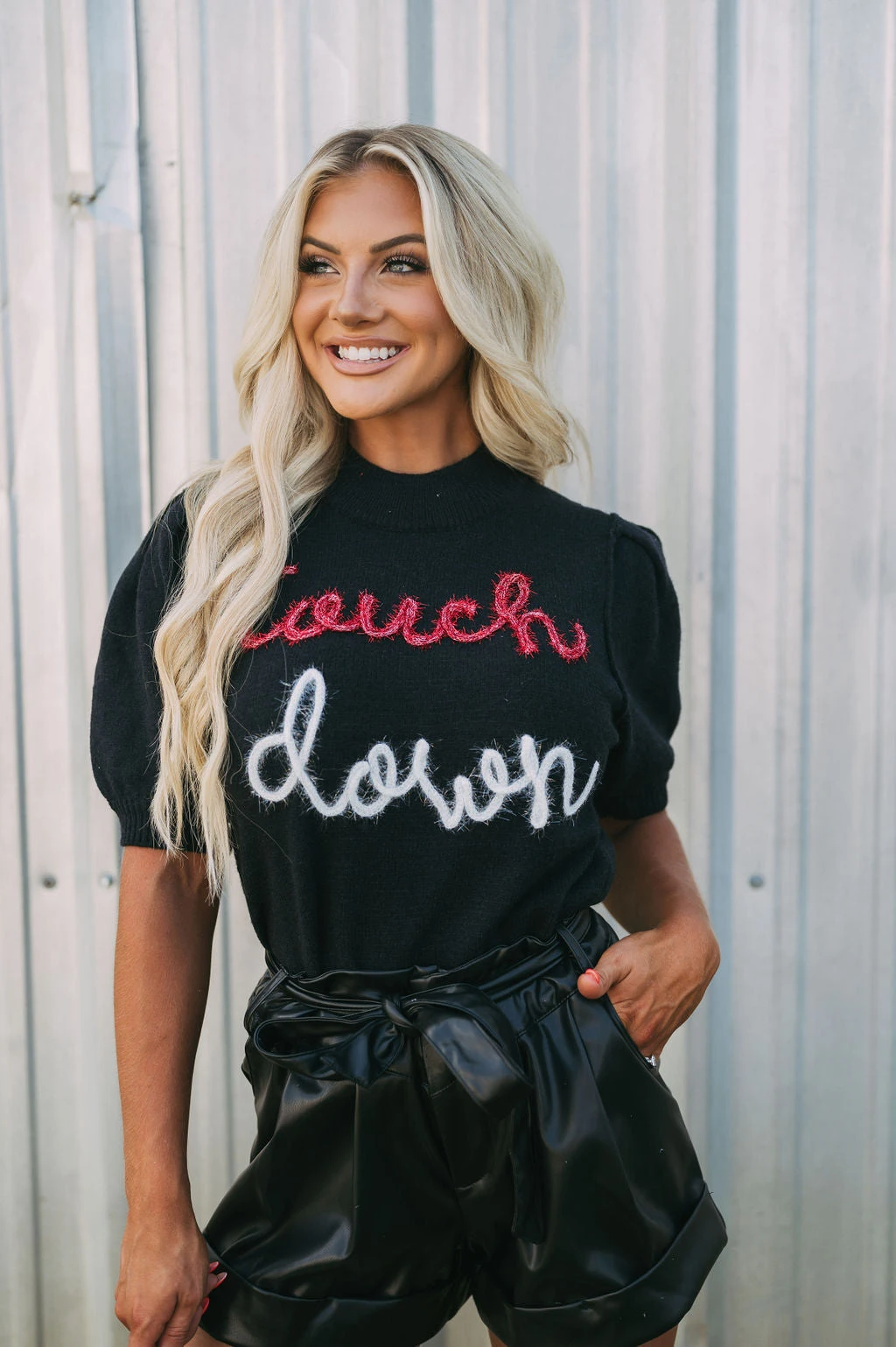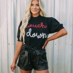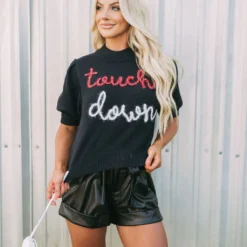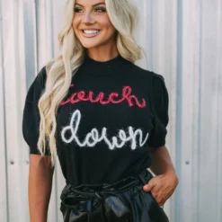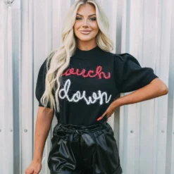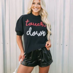 Get game-day ready in this cute sweater top! The Touchdown Puff Sleeve Sweater radiates comfort and luxe style. Its mock neckline, ribbed trim, and eye-catching “touchdown” in red and white sparkles bring fashion and fun together.