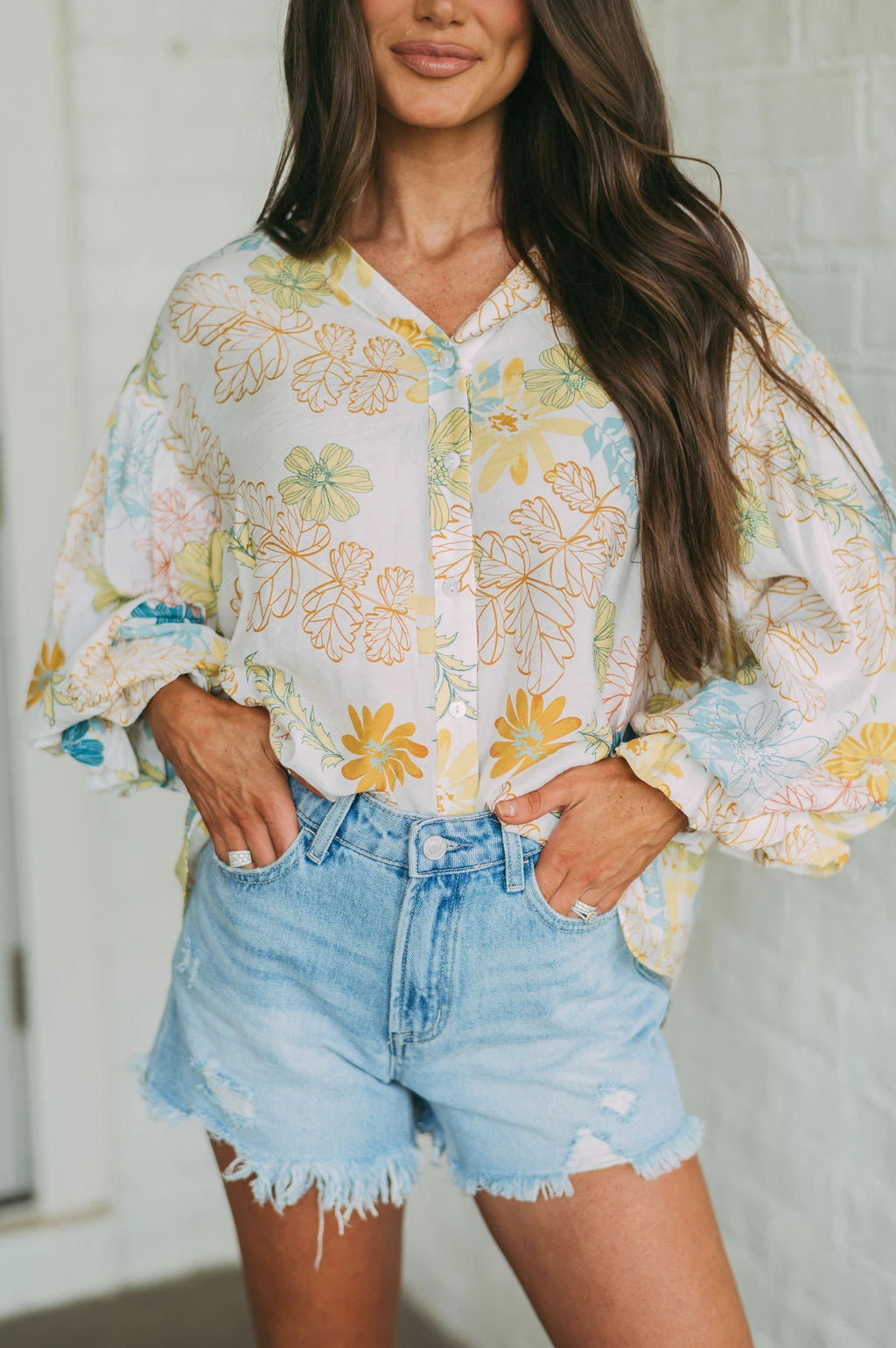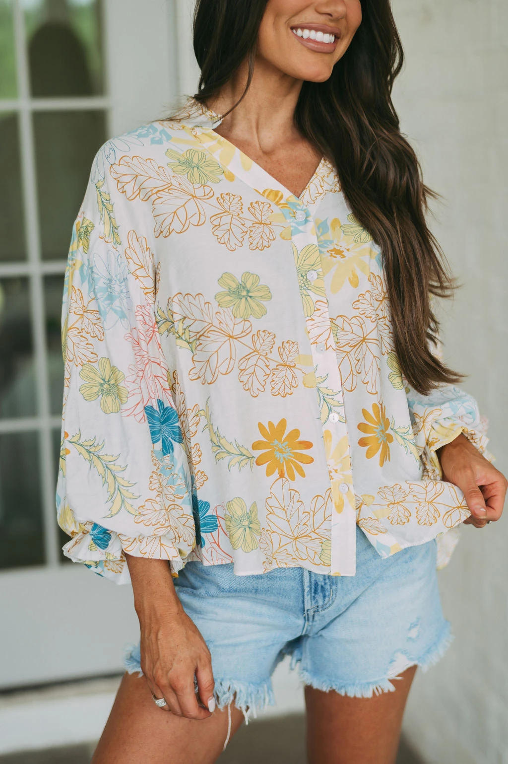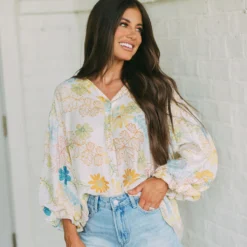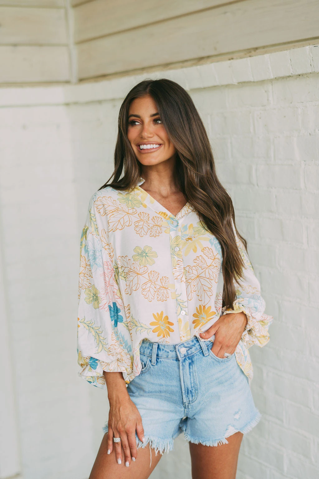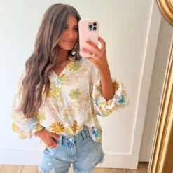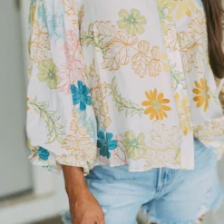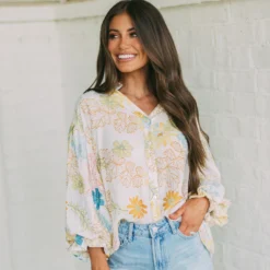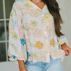 – This Tropics Button Blouse is a stylish choice for the spring season. The cream and teal mix floral design is eye-catching, and the bubble sleeve and frill neck detailing add a special touch. Perfect for work or a night out.