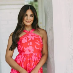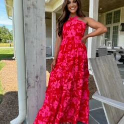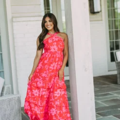 Feel the summer breeze in our beautiful Tropics Halter Maxi Dress. This exquisite dress features a pink and red floral pattern, halter neckline, ruffled detailing, and adjustable straps, so you can find your perfect fit. Step out and sparkle in the sunshine!