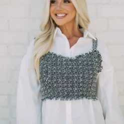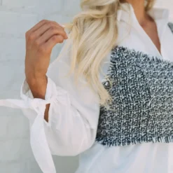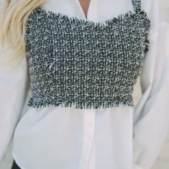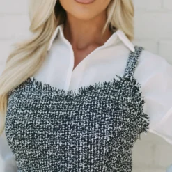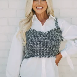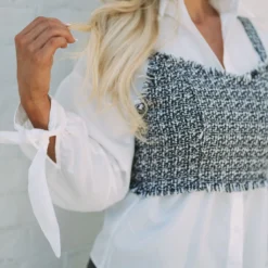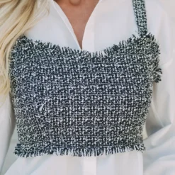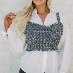 - This tweed button down combo top is a stylish and contemporary addition to any wardrobe. Crafted with a black and white tweed crop top, side zipper closure and frayed detailing, this piece also features a classic white button down top and collared neckline paired with wrist tie closure for a chic, modern twist.