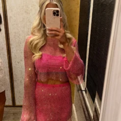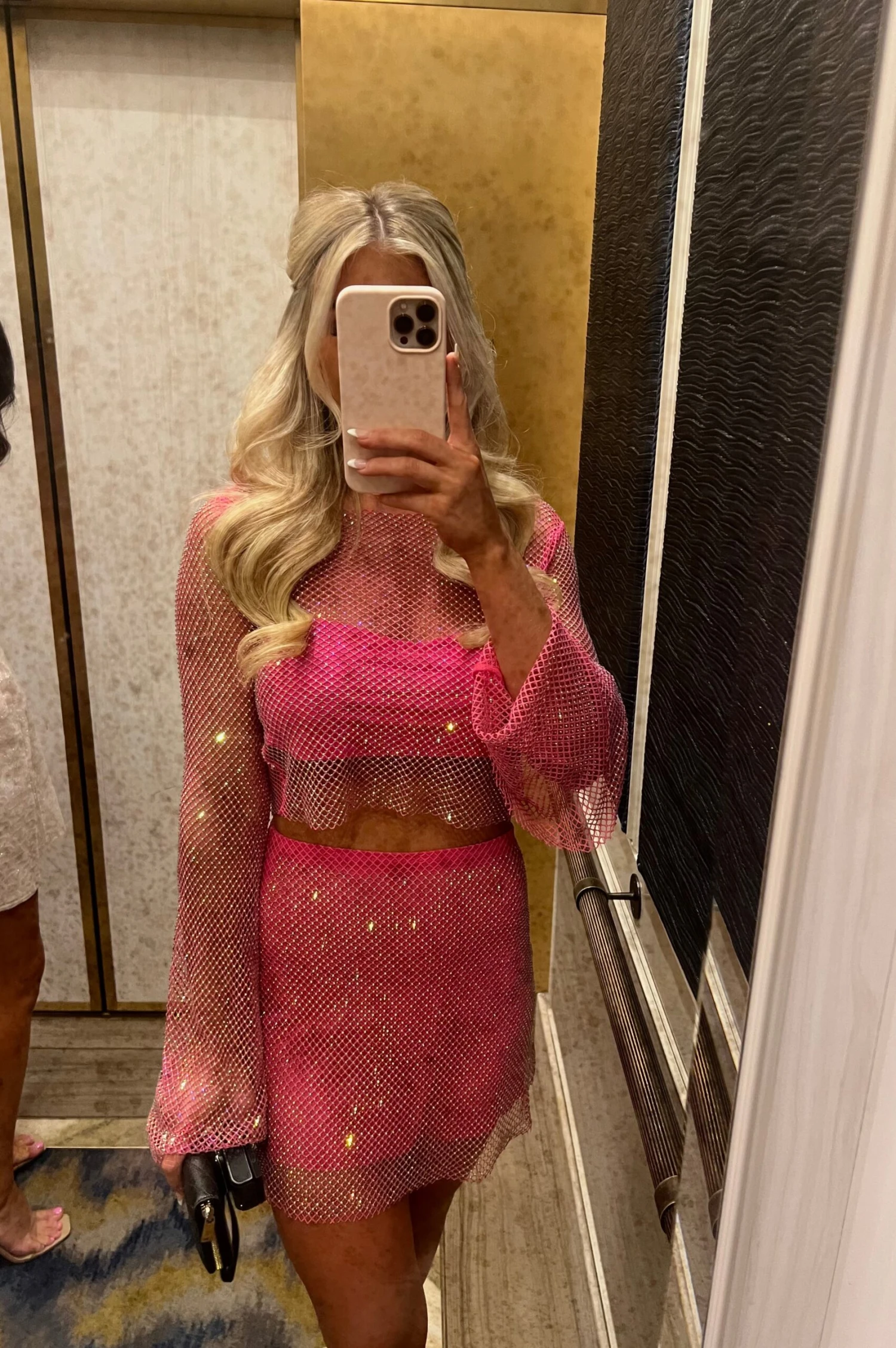This party-ready top is sure to make you sparkle! The Vegas Rhinestone Top is made with a pink bandeau undershirt and long sleeves. Bright rhinestones adorn the top while a cowl neck back detail adds a touch of elegance. Perfect for any special occasion.